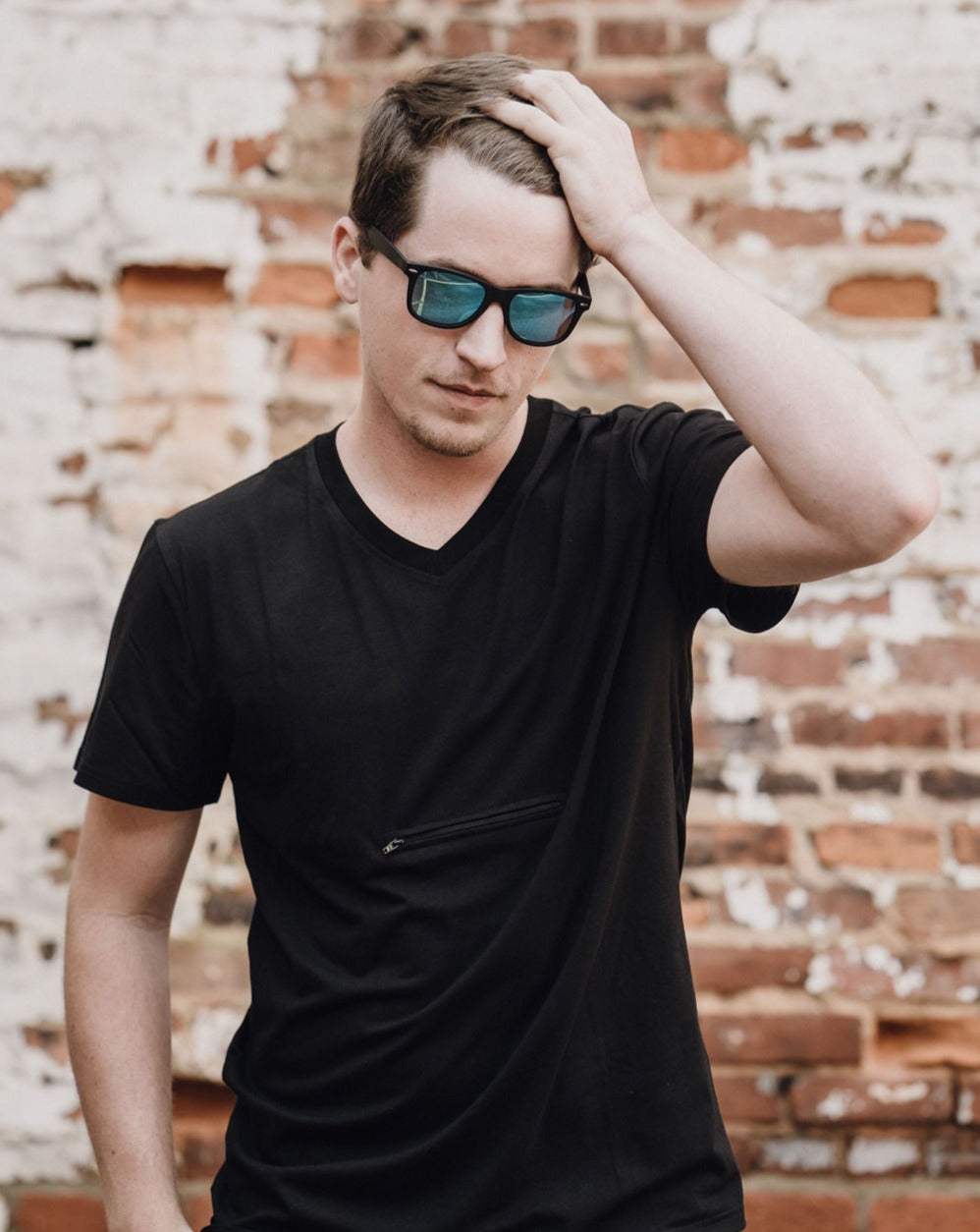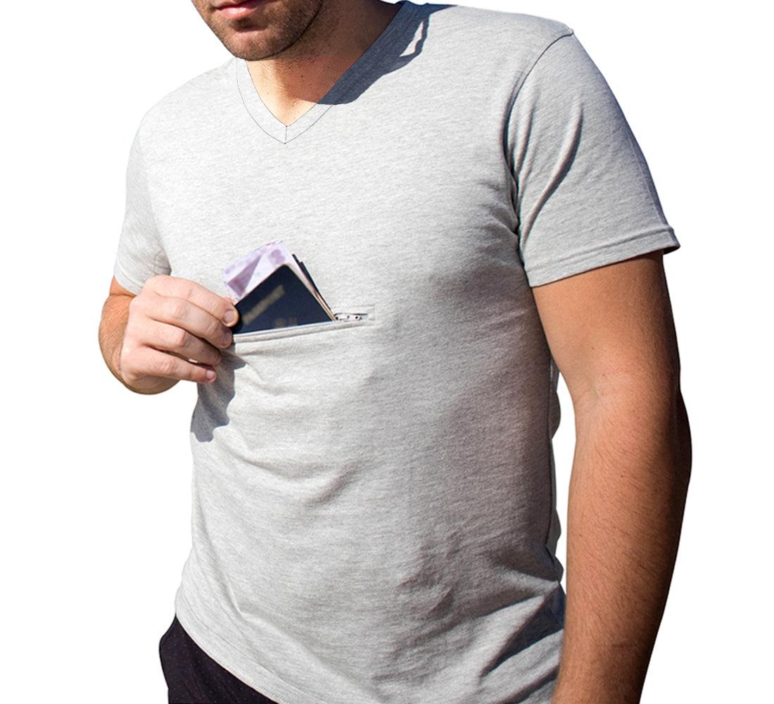 V-neck T-shirts, with one hidden zipper pocket under each arm. The pockets hold all your valuables securely: cell phone, passport, credit cards and cash and even keys all fit comfortably.